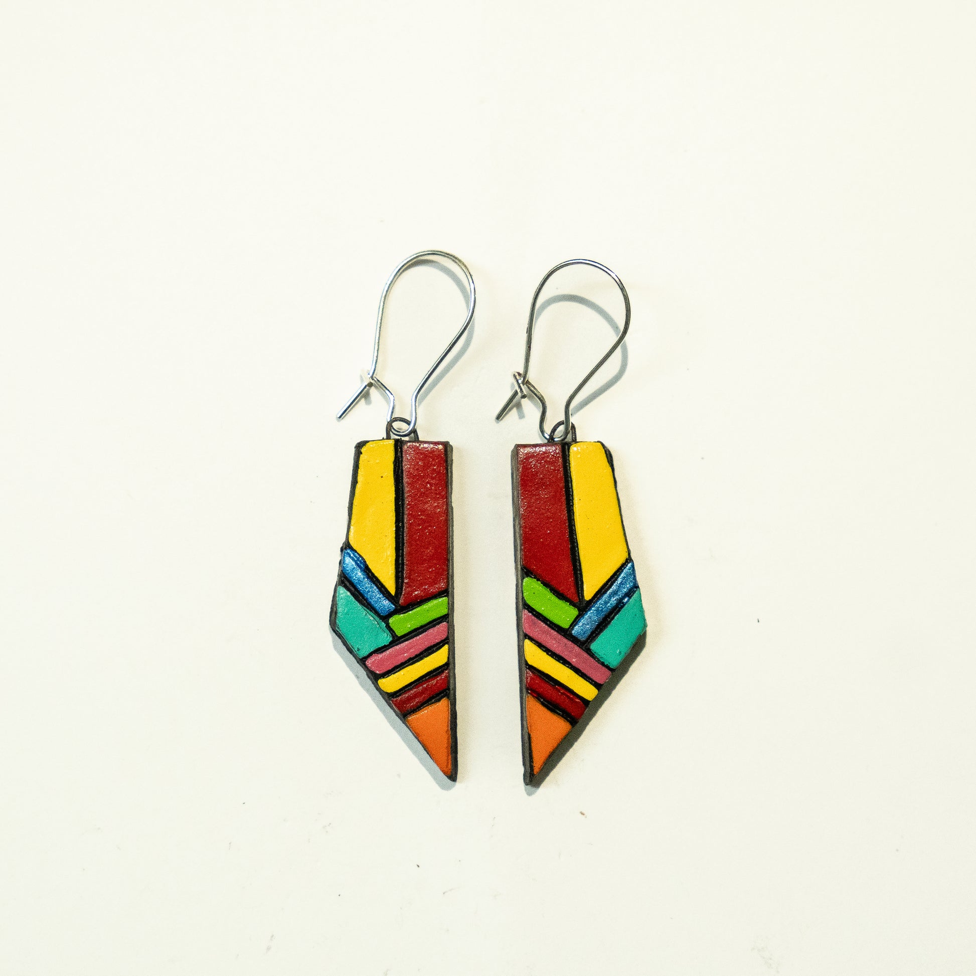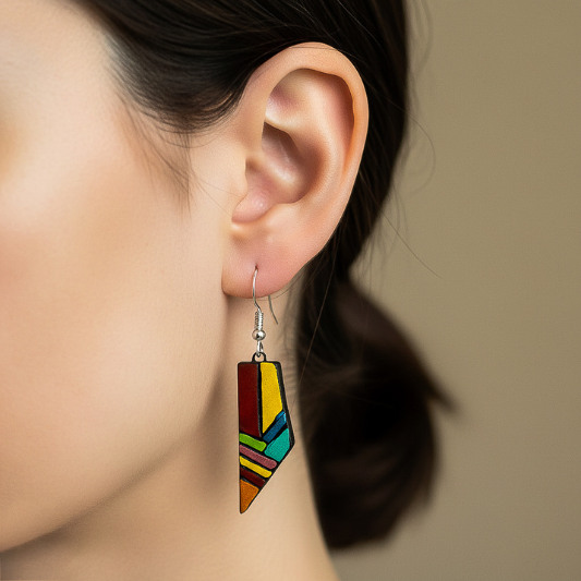 These earrings glow with fiery tones — red, orange, yellow, and teal — arranged in a symmetrical shard design that feels both tribal and contemporary. A bold choice for those who love warm palettes and geometric flair. Handcrafted by women artisans, they’re a celebration of fire and form.