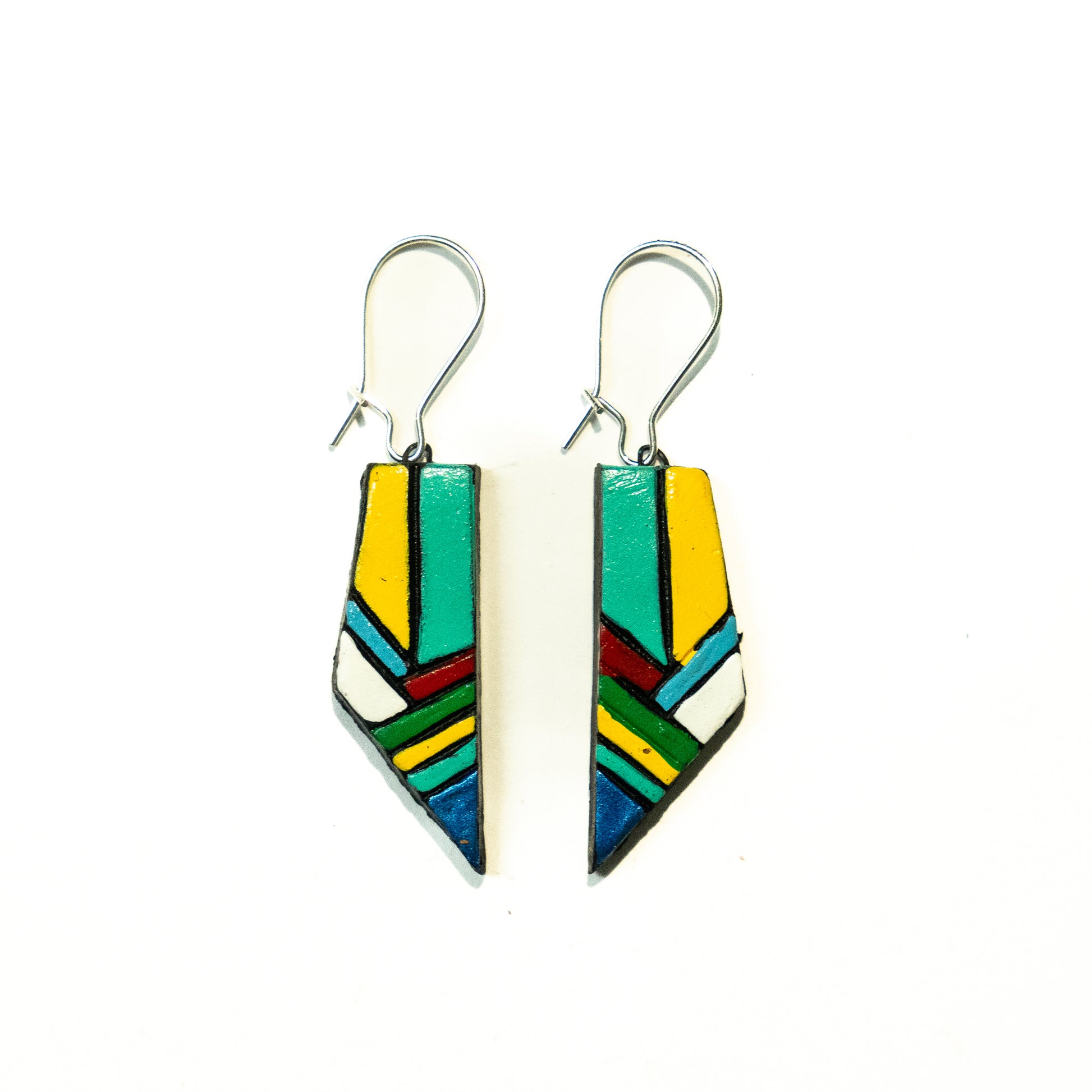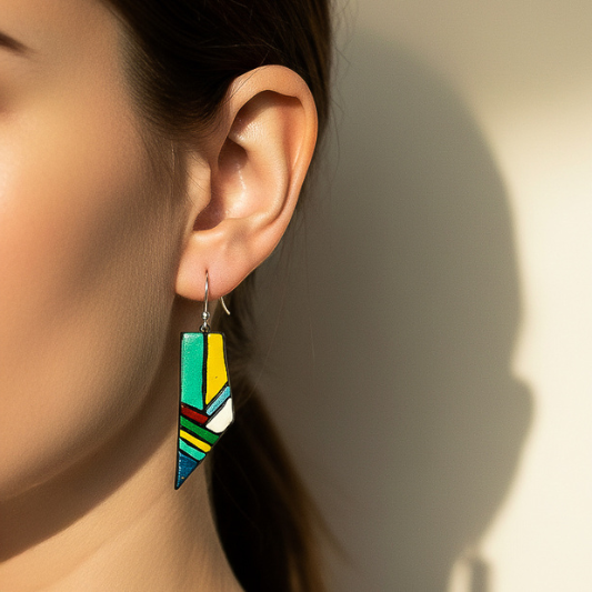 Featuring a crisp palette of teal, yellow, red, white, and blue, these angular earrings bring a fresh energy to the shard silhouette. The symmetrical design evokes modern art and tribal geometry, making them perfect for bold, expressive styling. Handcrafted by women artisans, they’re a wearable canvas of creativity.