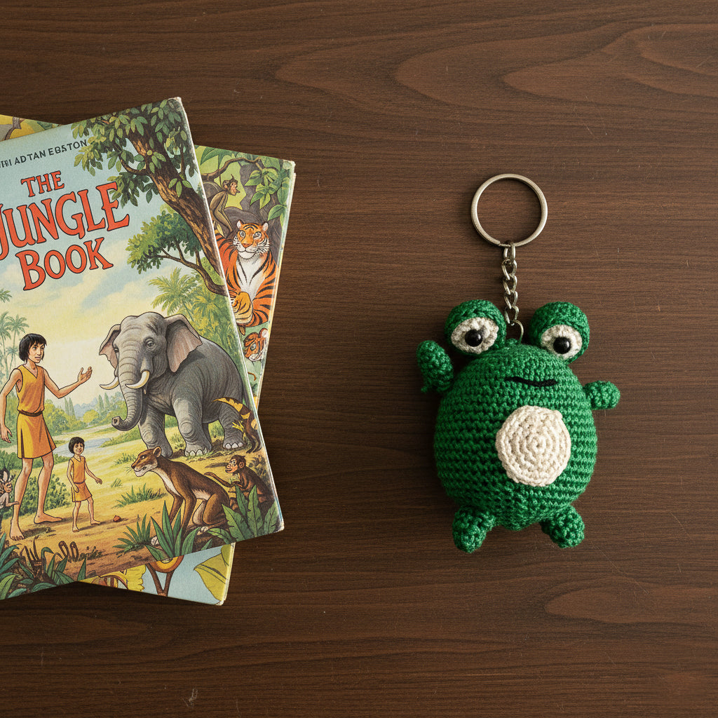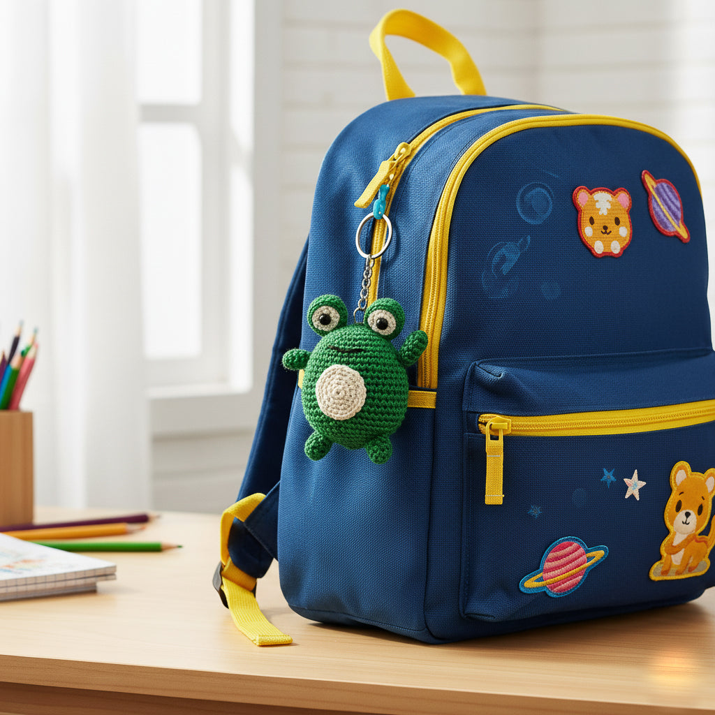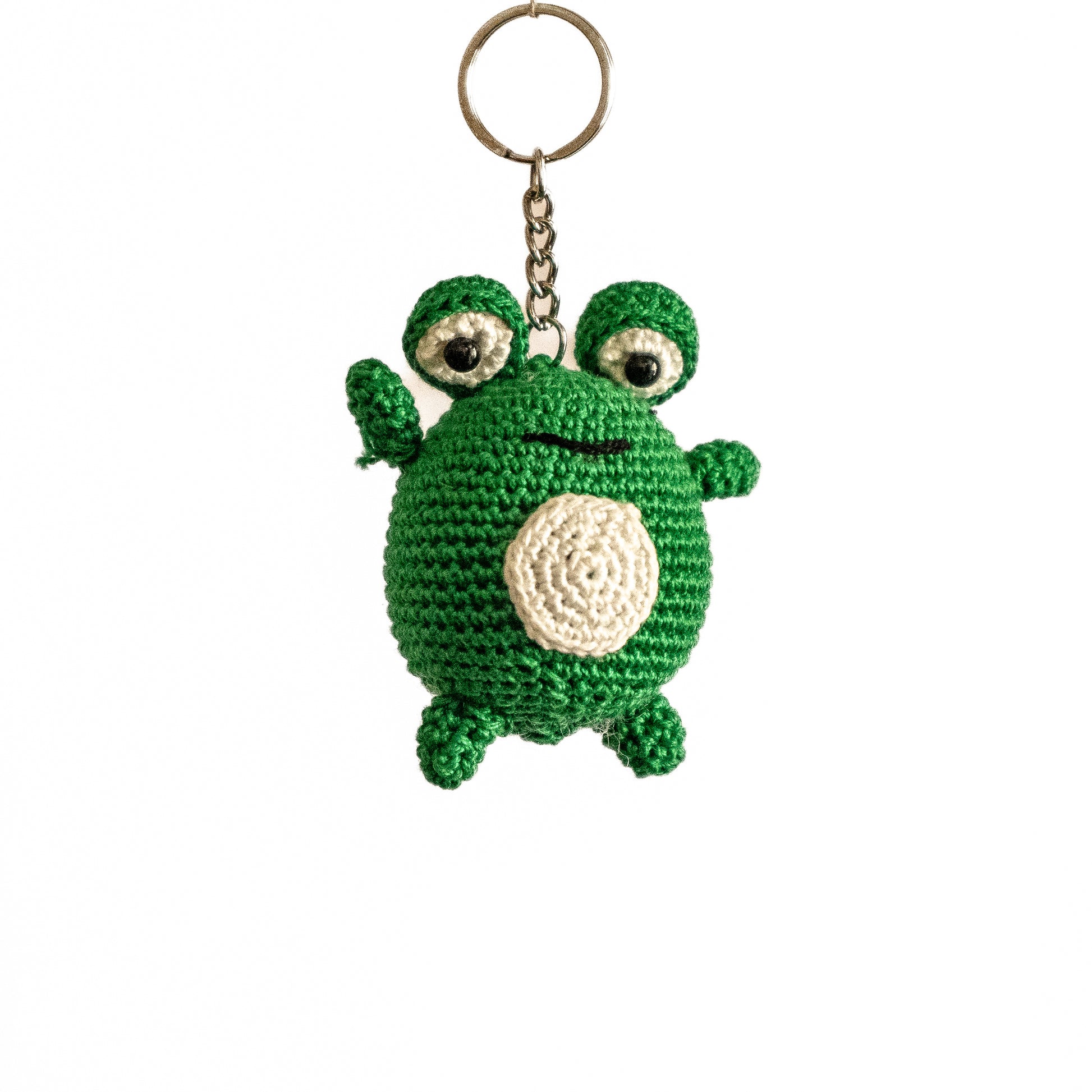 Crafted in lush green yarn with a soft white belly, this handmade frog keychain radiates joy and curiosity. Its wide eyes and tiny limbs bring a smile to any day. A whimsical charm inspired by pondside serenity, perfect for gifting or personal delight.