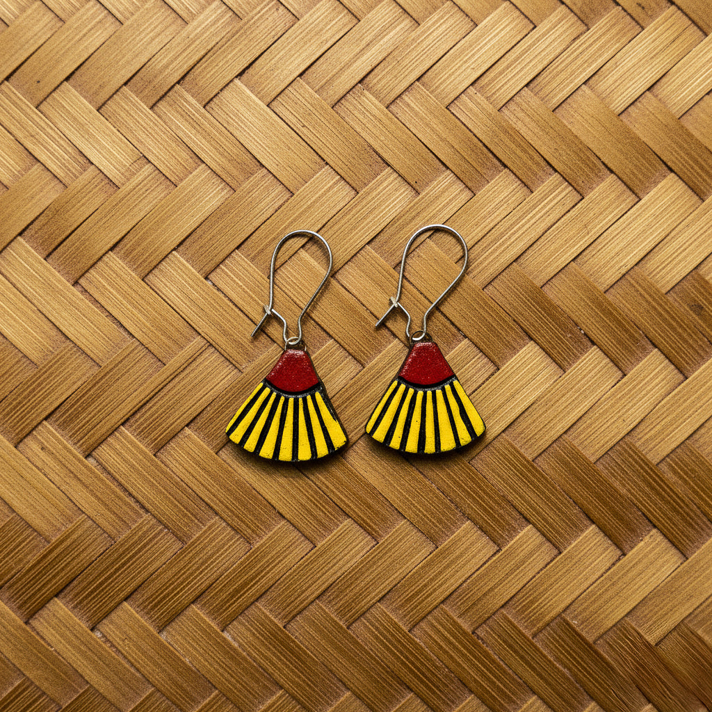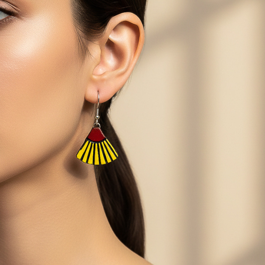 Radiating warmth and rhythm, these fan-shaped earrings feature a bold red top and golden yellow blades outlined in black. The design channels festive energy and traditional motifs, making them ideal for celebratory styling. Handcrafted by women artisans, they’re a tribute to movement, light, and cultural flair.