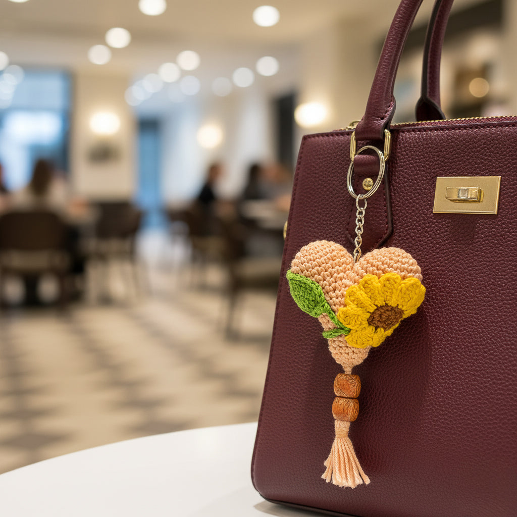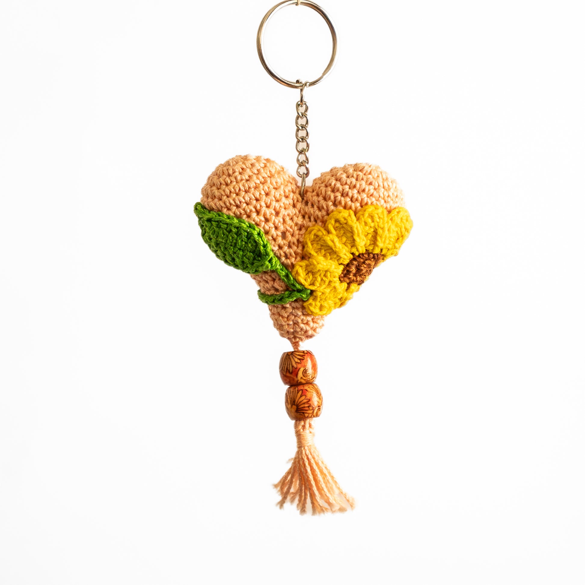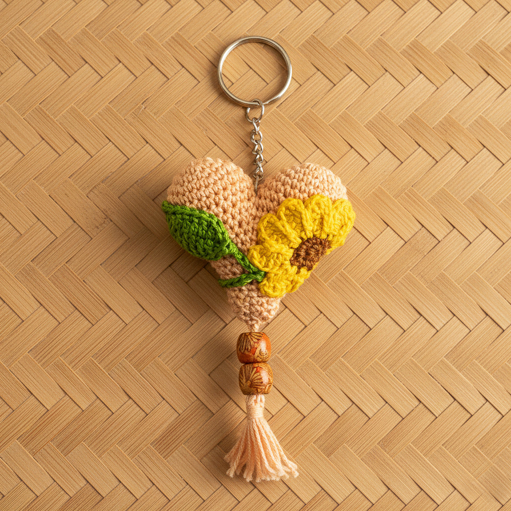 Handcrafted with peach yarn and adorned with a vibrant sunflower and leaf, this crochet heart keychain celebrates nature’s warmth and renewal. Wooden beads and a soft tassel add earthy elegance. A meaningful gift that symbolizes growth, love, and artisan beauty.