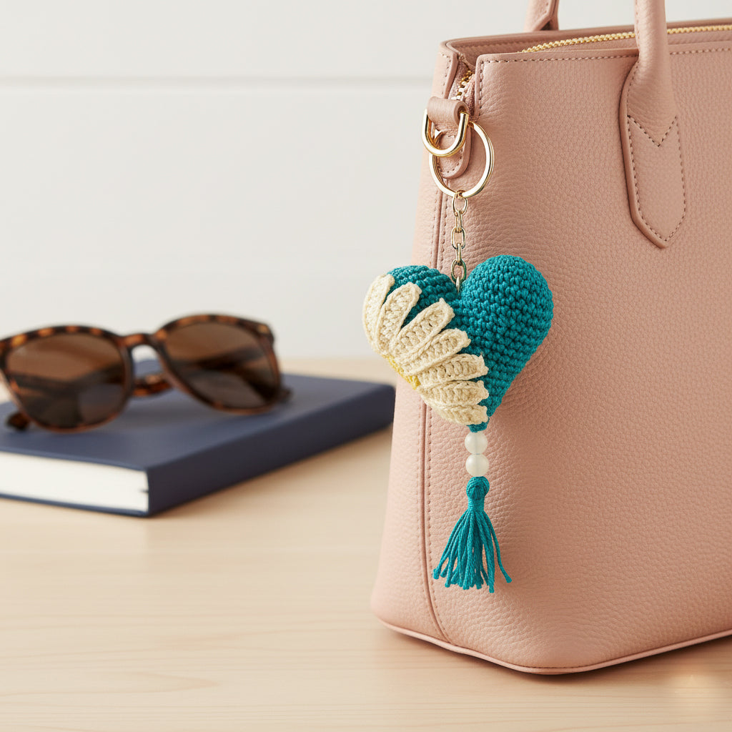 This crochet heart keychain is handmade in vibrant turquoise yarn and adorned with a white daisy and yellow center. Finished with white beads and a soft tassel, it symbolizes joy, renewal, and nature’s grace. A meaningful gift full of color and care.